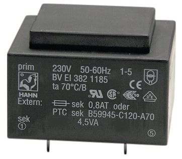 Kretskorttransformator 4,5VA 2x18Vac
