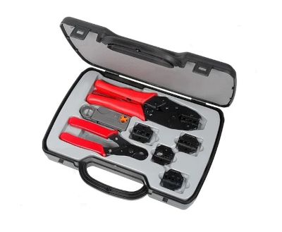 | Krymptångsats för koaxialkontakter. Satsen innehåller 5 par krymptänger, avmantlingsverktyg för koaxialkablar, skruvmejsel för byte av krymptångspar samt kabelavbitare och bärväska. |